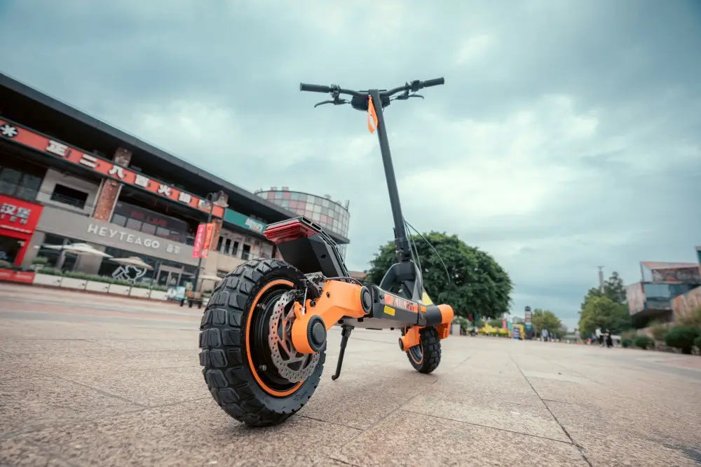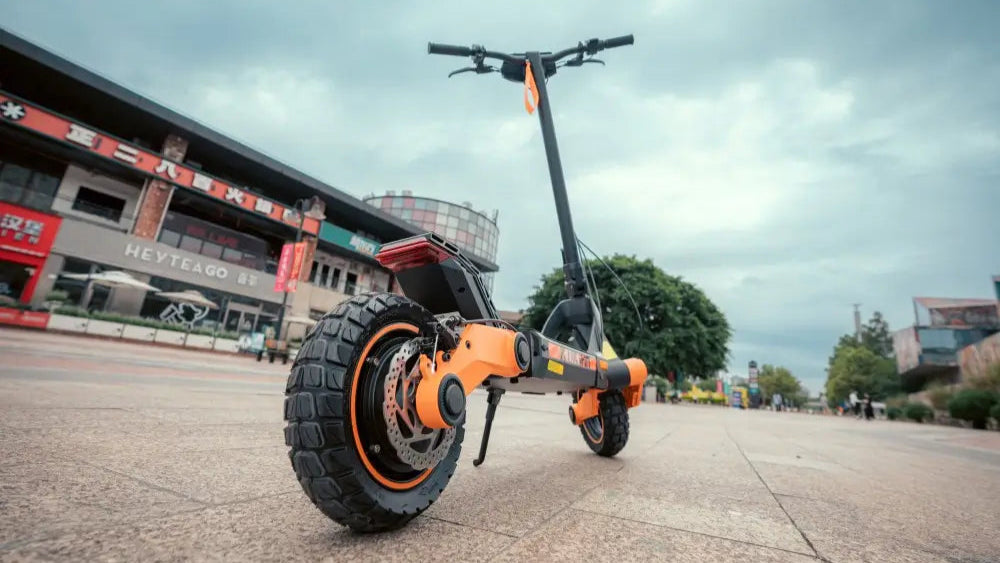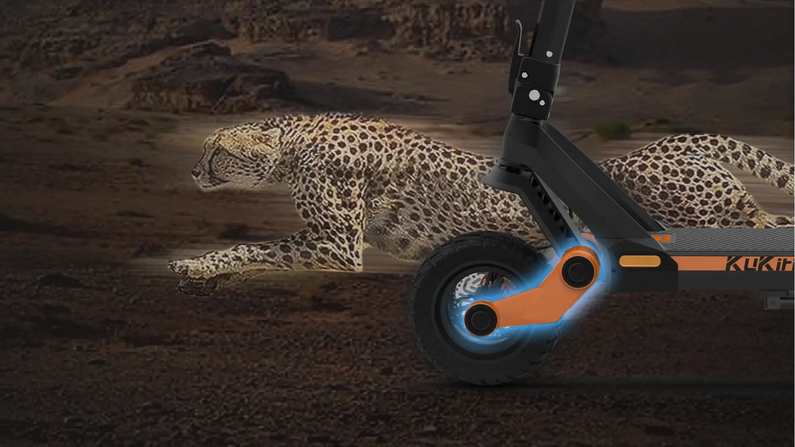 Der Kukirin G3 ist mit einem robusten Vierarm-Stoßdämpfungssystem ausgestattet, das jedes Terrain mühelos bewältigt. Mit seinem bionischen Cheetah-Arm-Stoßdämpfungsdesign sorgt er für eine ruhige, stabile Fahrt und kombiniert modernste Technik mit moderner Ästhetik. Egal, ob Sie auf holprigen Straßen fahren oder durch die Straßen der Stadt fahren, der G3 bietet seinen Fahrern jederzeit ein zuverlässiges, sicheres und komfortables Erlebnis.